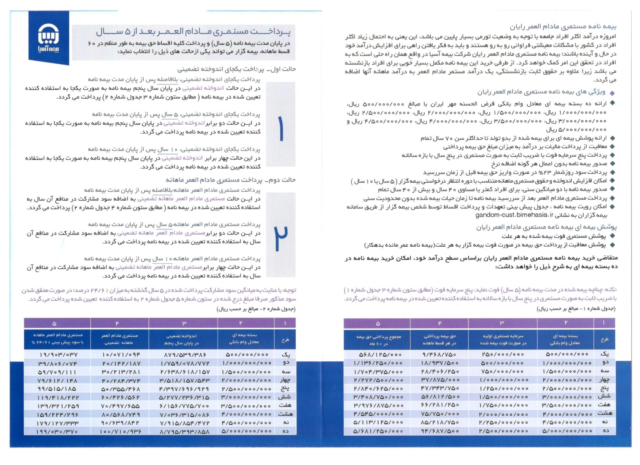 - پرداخت مستمری مادام العمر بعد از سررسید بیمه نامه تا زمان حیات بیمه شده بدون محدودیت سنی :